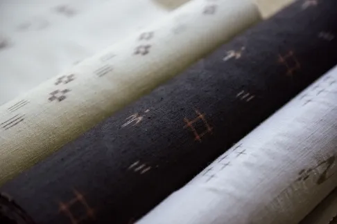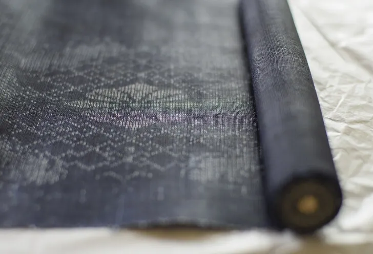 This is a fabric dyed almost black and very deep indigo made by weaving a thread called vu made from Ramie that is dyed with indigo several times. Since the thread started being tightened by machinery in modern times, it has become possible to express a complex pattern of small cross-shaped patterns. Another unique point is that the whole cloth is given luster and a firm texture.