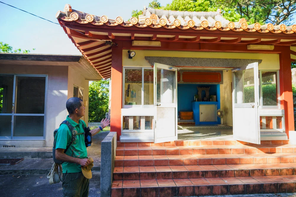 Taira’s village tours start at the Kamiyaa, a sacred site, with a prayer for safe journey. Visitors are then guided through key locations such as the Asagimaa, where gods are believed to descend for rituals, and Shichara Utaki, from where villagers worship Asumui. Kamiyaa used to be the home of the Noro, a female priestess who presided over spiritual matters. On the left side of the house is Tōtōmee (ancestral tablets of Noro) and on the right is the Hinukan, a fire deity honored in kitchens across Okinawa. The Hinukan, once overseen by the Noro, became the village's main object of worship, and Kamiyaa became the center of their spiritual life.