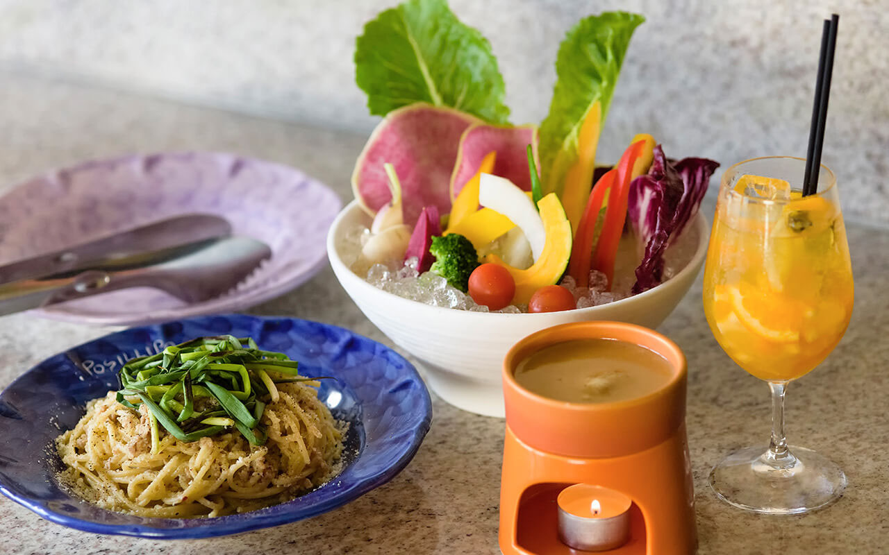 Authentic Italian cuisine with expansive ocean views, not far from Naha Airport. House specialties include the moist, chewy Neapolitan pizza, pasta made daily with an original blend of flours, and fresh meats and vegetables from Okinawa grilled over charcoal and firewood. Feel the sea breeze on your skin as you immerse yourself in the romance of travel.