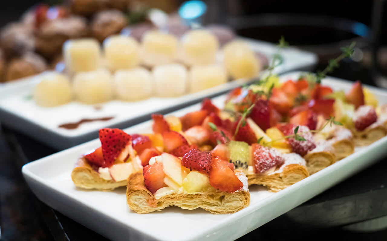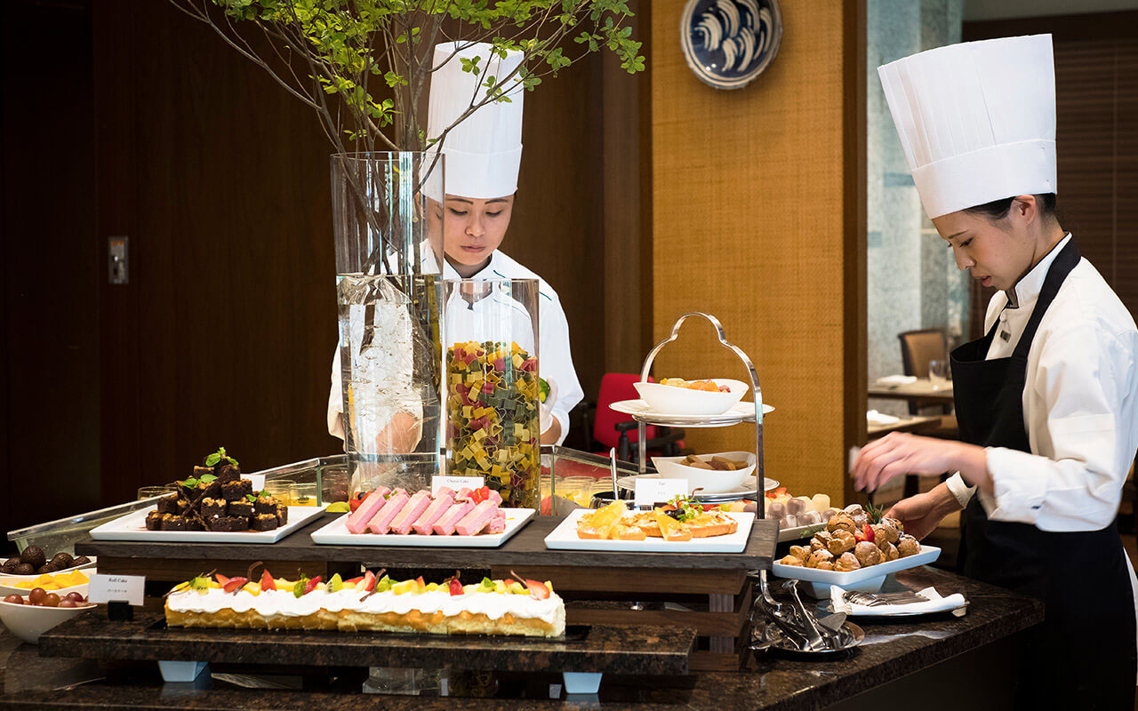 Buffet dining with plentiful seasonal produce from Okinawa and the mainland. The distinctively varied sumptuous dishes at breakfast and lunch will satisfy you completely. At lunchtime, enjoy watching the chefs demonstrate their skills as they cook the dishes of the day. Recommended days are Monday (sushi) and Wednesday (desserts).